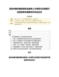 F-005RH0;关于“论文”中“论文指导或论文设计”的论文参考范文文档。正文共5,078字,word格式文档。内容摘要:现行高职教育人才培养模式存在的问题,现行人才培养模式所传授专业知识与企业实际需求脱节,现行人才培养模式导致学生掌握的操作技能与企业实际需求脱节,现行人才培养模式让学生职业素养与企业预期差距较大,学校与企业价值取向存在差异,双方难以形成合力,在某些方面甚至出现冲突,校企合作背景存在较大差异,成功的人才培养模式难以推广,加强教学改革力度,合理专业设置,提高培养质量,完善“订单”培养模式,整合资源,改善实训管理,加强素质教育,将企业文化融入校园文化,提高职业素养,重视企业主体地位及利益诉求,逐步完善相关法律法规。